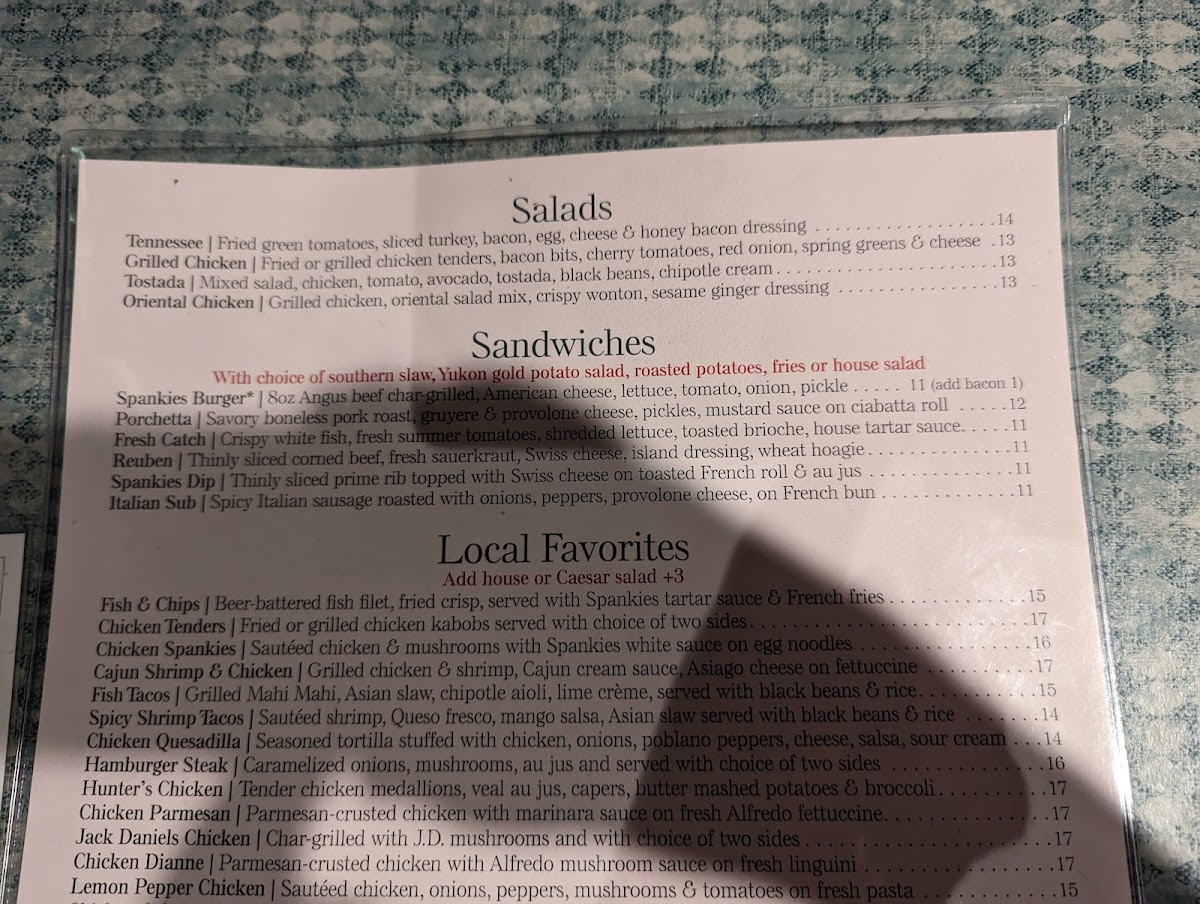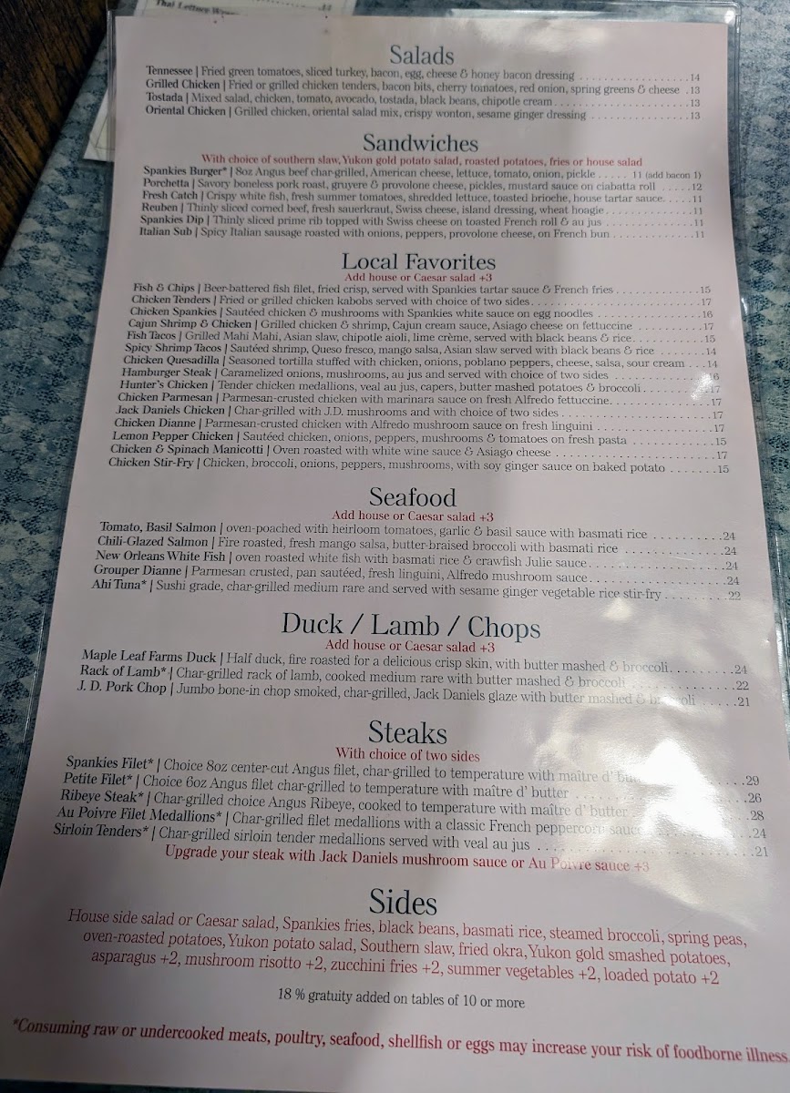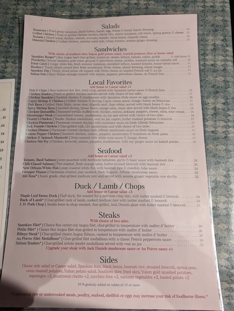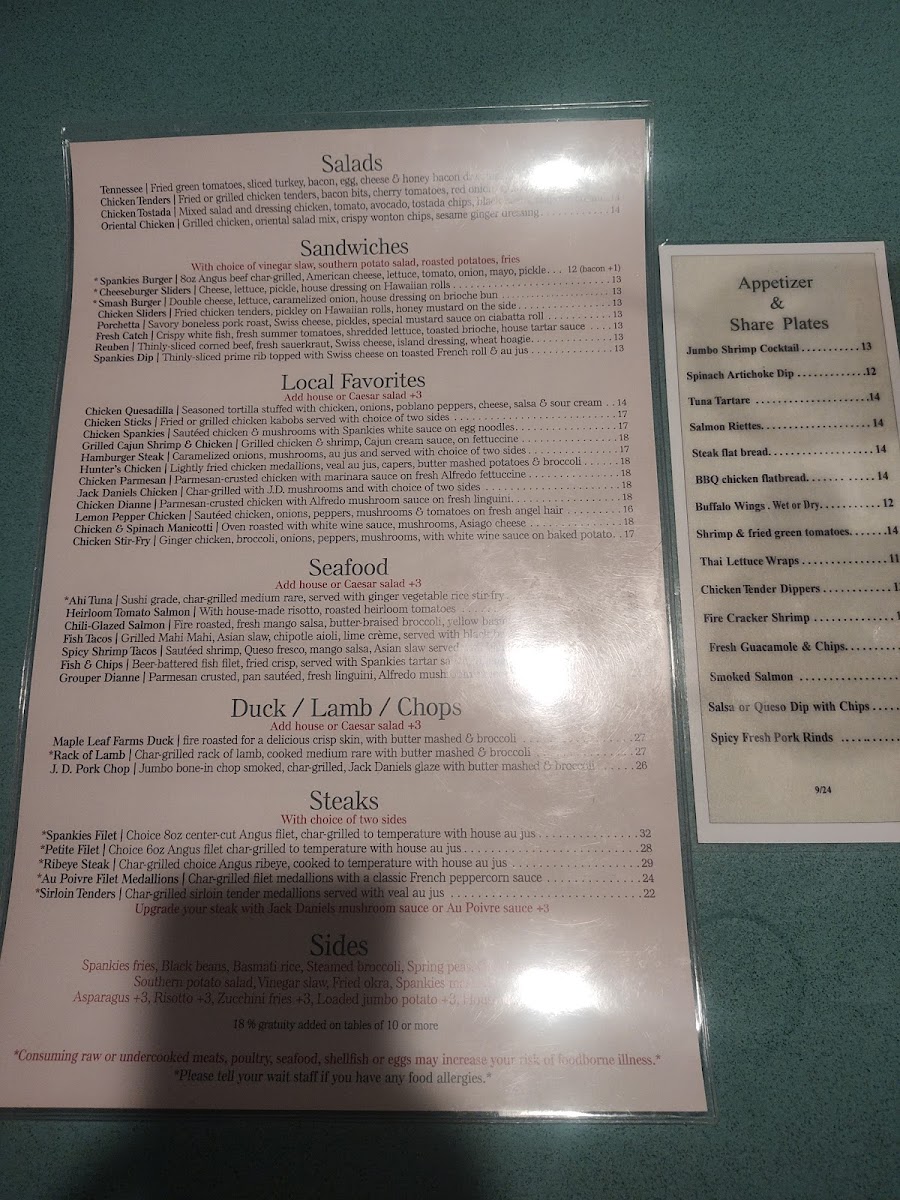 Welcome to Spankies, a delightful culinary gem located in Cookeville, TN. Renowned for its vibrant atmosphere, Spankies delivers a menu packed with local favorites that excite the palate. Indulge in the Chicken & Spinach Manicotti with its creamy white wine sauce, or savor the heat of Cajun Shrimp & Chicken draped in a rich Cajun cream sauce on fettuccine. Seafood lovers will rejoice at the Grouper Dianne and Lump Crab Cakes, each offering a symphony of flavors paired with seasonal vegetables.